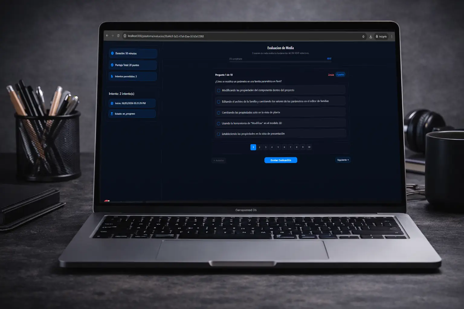 E-learning CCD es una plataforma educativa completa que integra módulos de clases en vivo y contenido asincrónico, permitiendo a los estudiantes consumir el material a su propio ritmo o participar en sesiones interactivas en tiempo real. El sistema de exámenes integrado evalúa el progreso del usuario con retroalimentación inmediata, habilitando la acreditación automática al superar los umbrales definidos por cada curso.